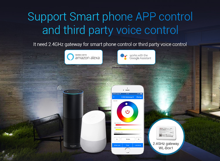 - Über die Sprachsteuerung von Amazon Alexa und Google Assistant, die Steuerung mobiler Apps, die 2.4G-Fernbedienung oder die Bedienfeldfernbedienung, das stufenlose Dimmen und das Mischen von Farben, um einen angenehmen Lichteffekt im Freien zu erzielen.